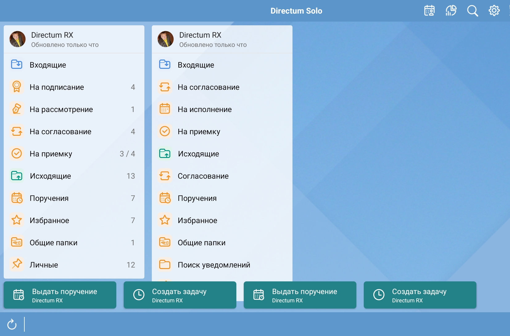 Отображение просроченных задач и заданий. Способ отображения просроченных задач и заданий: выделение красным только срока или темы и срока. Открывать задания с поручениями на вкладке. Выбор вкладки, которая отображается первой при открытии задания с поручениями. По умолчанию: вкладка вложений при наличии основного документа и отсутствии поручения, иначе – вкладка поручений. Можно выбрать открытие вкладки вложений при наличии основного документа или открытие вкладки поручений даже при отсутствии поручения. Устанавливать срок по умолчанию для поручений. По умолчанию автоматическая установка срока отключена. Можно выбрать одну, две, три недели или месяц. В результате срок будет рассчитываться в календарных днях. Отображать проекты поручений. Возможные значения: •Только мои – в Solo доступна работа только со своими проектами поручений и с проектами поручений замещаемых сотрудников; •Все – в Solo доступна работа со всеми проектами поручений. Кнопки создания на главном экране. Кнопки в главном окне для быстрого доступа к созданию задач и поручений.При необходимости можно добавить новые кнопки. При нажатии на кнопку Изменить можно удалить добавленные кнопки и изменить их порядок. Отображать совещания на главном экране. Включить показ списка ближайших совещаний на главном экране. Эта настройка доступна только на планшетах. Кнопки создания в списке папок. Кнопки для быстрого доступа к созданию задачи, документа или поручения. Можно добавить новые кнопки из списка, а по кнопке Изменить – удалить добавленные кнопки или изменить их порядок. Эта настройка доступна только на планшетах.
