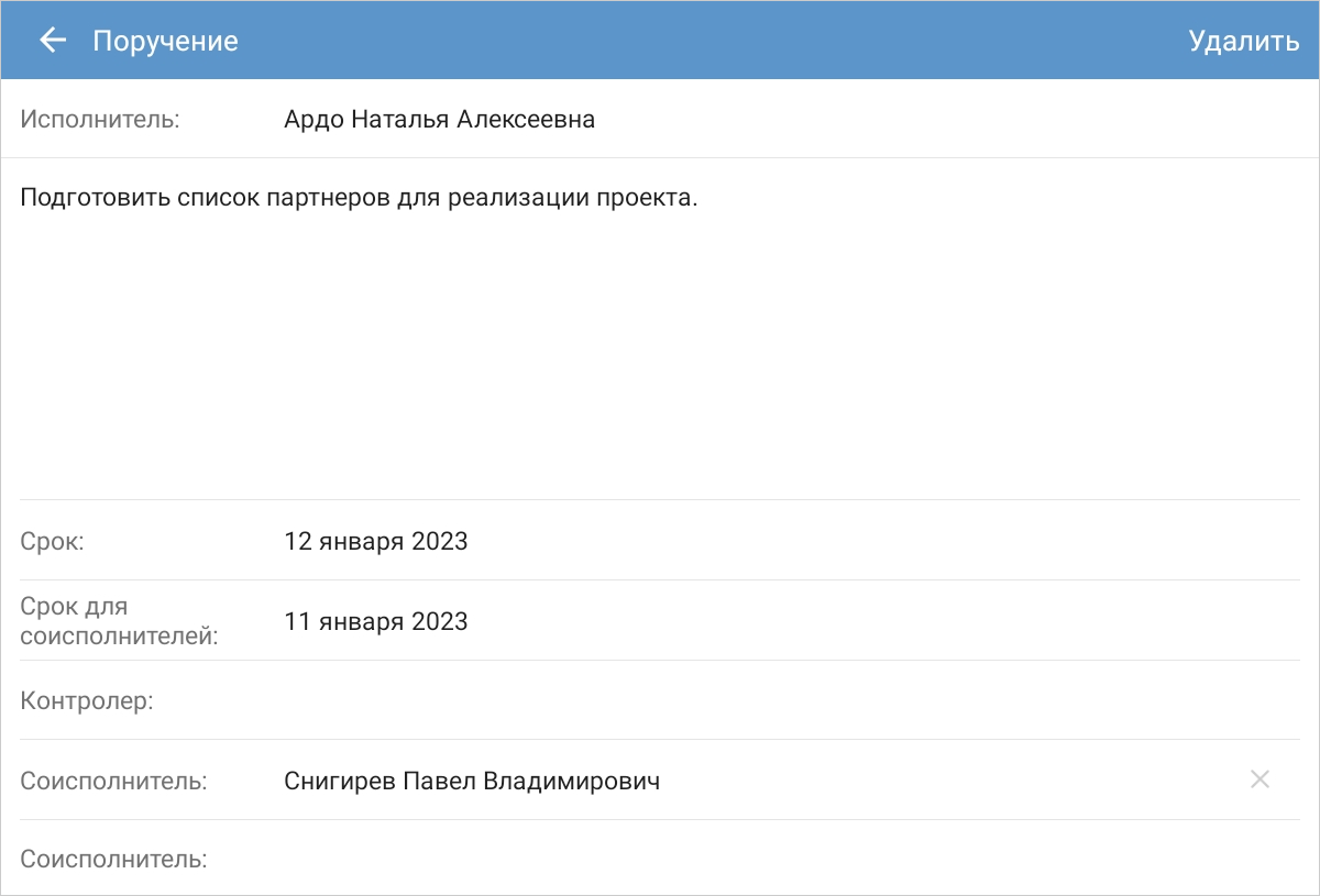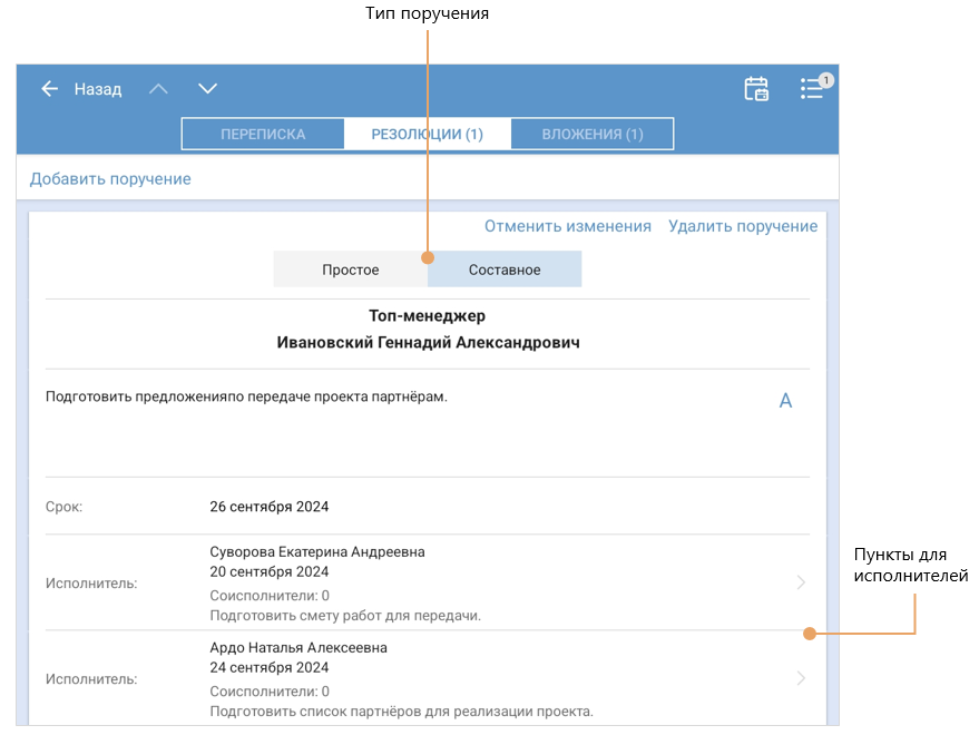 В результате откроется карточка поручения. Выберите его тип, укажите исполнителей, срок и текст поручения. Затем отправьте поручение на исполнение.