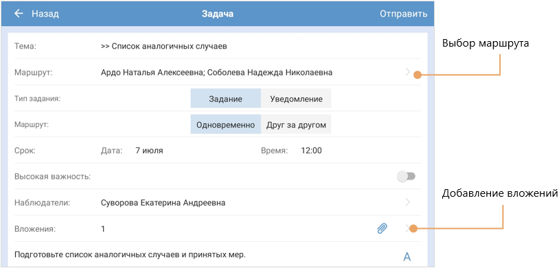 Укажите параметры задачи, например маршрут и срок. Если нужно добавить вложения, создайте новый документ или выберите существующий. Для быстрого добавления текста в поле для комментария используйте автотексты. Затем отправьте подзадачу в работу по кнопке Отправить в правом верхнем углу окна.