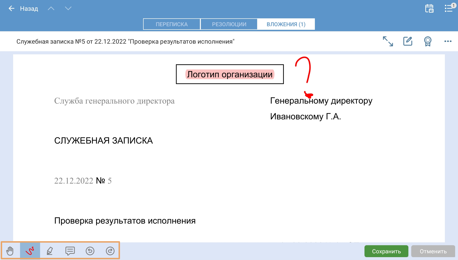 Примечание. Если помощник руководителя подготовил проект резолюции по документу, задача на рассмотрение открывается на вкладке «Резолюции». В этом случае для просмотра содержимого документа переключитесь на вкладку «Вложения».