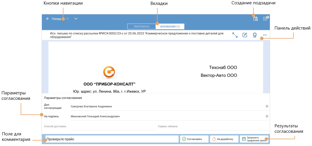 1.Откройте задание на согласование. На экране отображается первый документ из вкладки «Вложения».