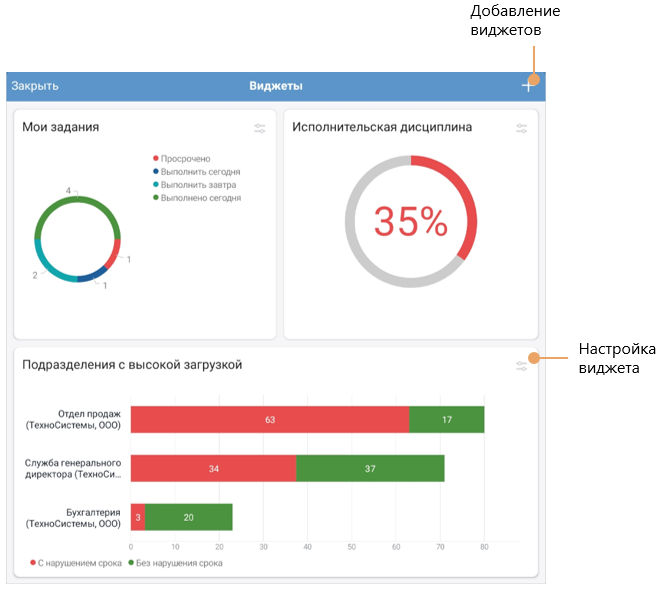 Область виджетов – это контрольная панель с информацией по заданиям, документам, исполнительской дисциплине и загрузке. Каждый сотрудник может настроить область виджетов для получения необходимой информации и организации своей работы.