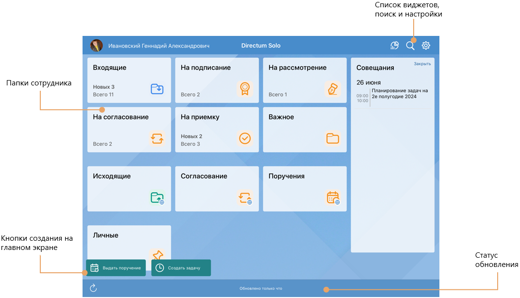 На планшете на главном экране, а также в папках по умолчанию доступны кнопки быстрых действий Выдать поручение и Создать задачу.