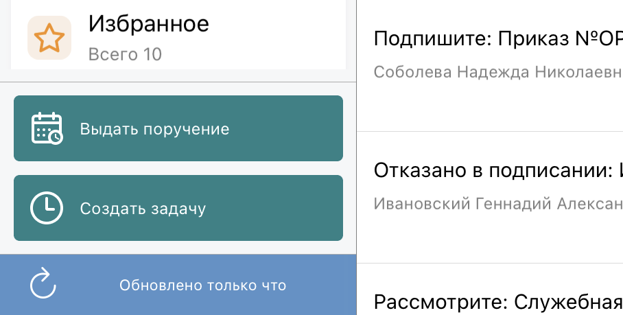 Список этих кнопок можно настроить под себя. Для этого перейдите в настройки приложения и выберите нужные кнопки в пунктах Кнопки создания на главном экране и Кнопки создания в списке папок. Например, на главном экране можно оставить кнопку Создать документ, а в папке «Входящие» – Выдать поручение и Создать задачу.