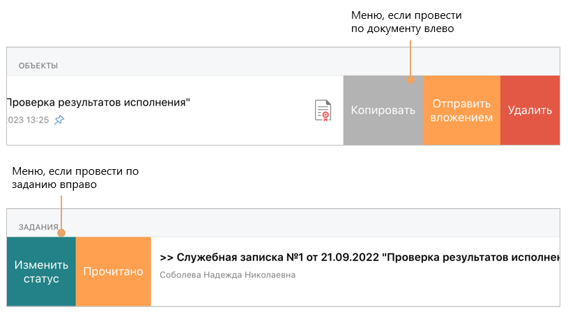 Если в списке провести по объекту влево или вправо, открывается его контекстное меню: