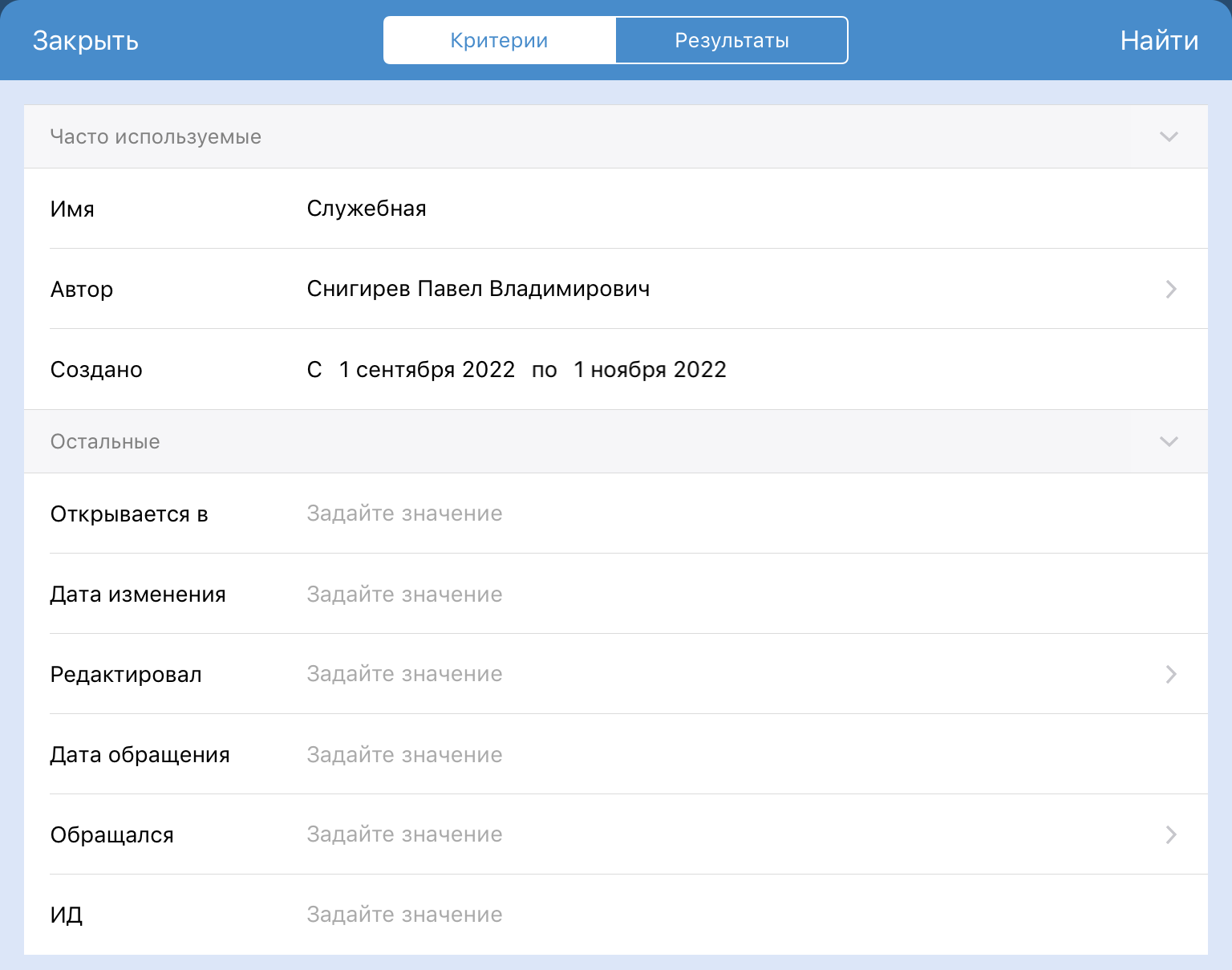 Совет. Критерии поиска, которые используются чаще всего, автоматически добавляются в группу «Часто используемые». Если нужных критериев там не оказалось, разверните группу «Остальные».