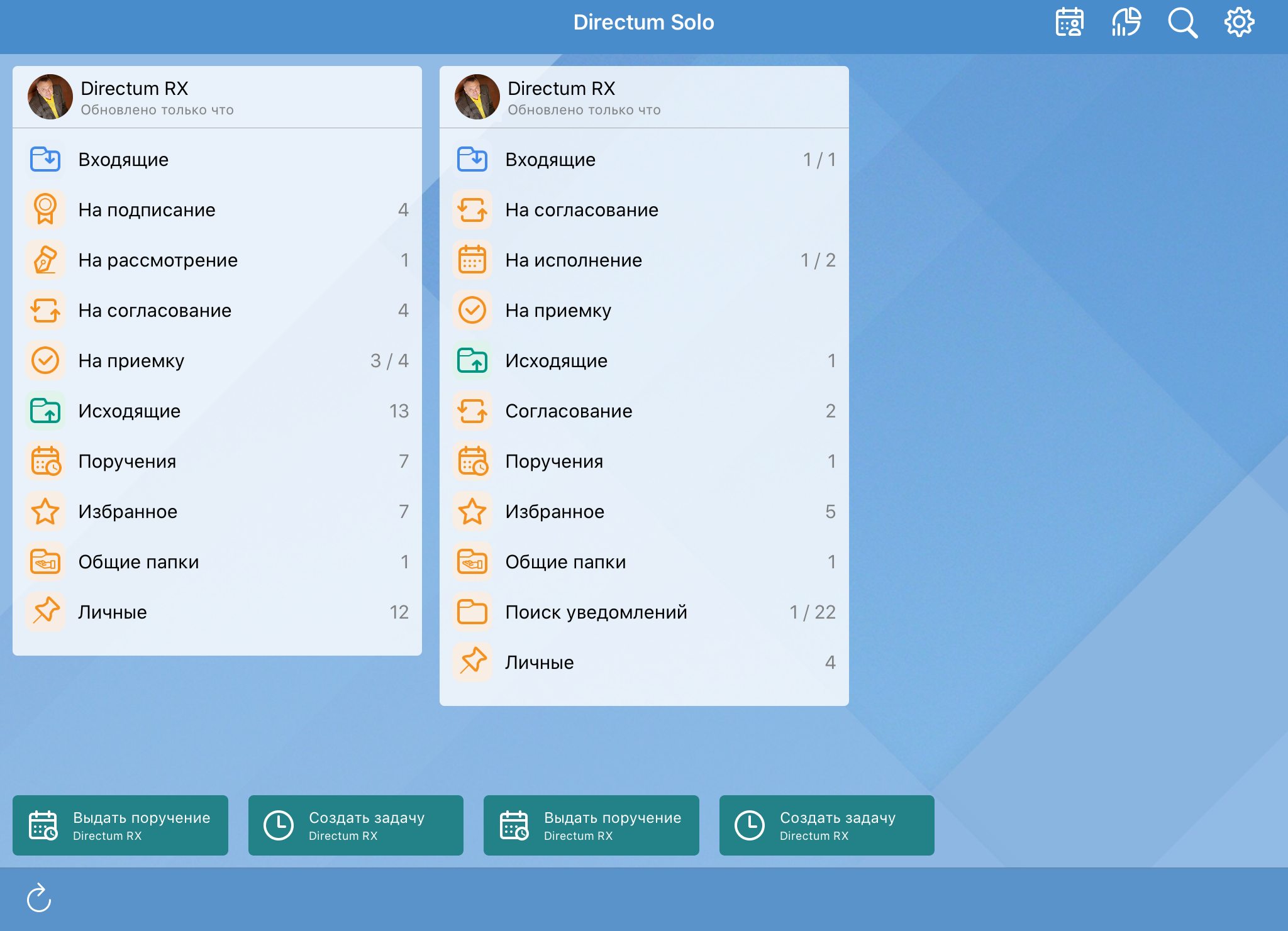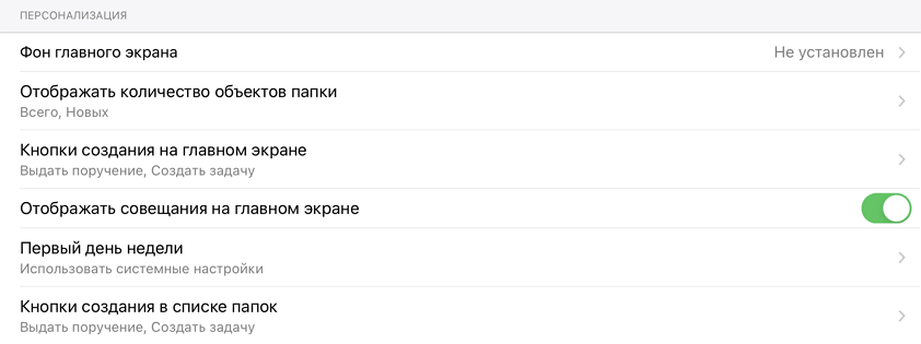 Фон главного окна. Для смены изображения выберите пункт Изменить и необходимый файл. Можно включить цветовой фильтр и размытие изображения. Отображать количество объектов папки. Подписи к папам с количеством объектов в них: •Всего – количество всех объектов папки. Подпапки не учитываются; •В работе – количество задач и заданий в состоянии «В работе»; •Новых – количество новых заданий. Можно выбрать одну или две подписи. Значение по умолчанию Всего, Новых. Кнопки создания на главном экране. Кнопки для быстрого доступа к созданию задачи, документа или поручения. Можно добавить новые кнопки из списка, а по кнопке Изменить – удалить добавленные кнопки или изменить их порядок. Эта настройка доступна только на планшетах. Отображать совещания на главном экране. Включить показ списка ближайших совещаний на главном экране. Эта настройка доступна только на планшетах. Первый день недели. День, с которого начинается неделя в календаре при указании срока поручения. Можно выбрать конкретный день недели или использовать системные настройки – в этом случае будут использоваться настройки ОС. Кнопки создания в списке папок. Кнопки в списке папок для быстрого доступа к созданию задачи, документа или поручения. Можно добавить новые кнопки из списка, а по кнопке Изменить – удалить добавленные кнопки или изменить их порядок. Эта настройка доступна только на планшетах.