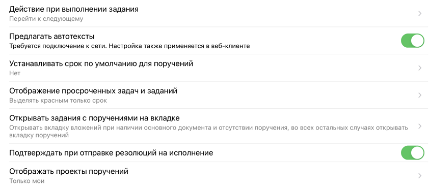 Действие при выполнении задания. Действие, которое будет происходить после выполнения задания. Возможные значения: •Перейти к следующему –открывается следующее задание или уведомление в списке. Значение по умолчанию; •Вернуться к списку – открывается список всех заданий текущей папки. Предлагать автотексты. Если флажок установлен, при добавлении комментария к задаче или заданию можно использовать автотексты. Они доступны, если устройство находится в сети. Настройка также применяется в проводнике Directum RX. Если автотексты выключены, статистика по часто используемым фразам не ведется. Устанавливать срок по умолчанию для поручений. По умолчанию автоматическая установка срока отключена. Можно выбрать одну, две, три недели или месяц. В результате срок будет рассчитываться в календарных днях. Отображение просроченных задач и заданий. Способ отображения просроченных задач и заданий: выделение красным только срока или темы и срока. Открывать задания с поручениями на вкладке. Выбор вкладки, которая отображается первой при открытии задания с поручениями. По умолчанию: вкладка вложений при наличии основного документа и отсутствии поручения, иначе – вкладка поручений. Можно выбрать открытие вкладки вложений при наличии основного документа или открытие вкладки поручений даже при отсутствии поручения. Подтверждать при отправке резолюций на исполнение. Признак запроса подтверждения при отправке резолюций на исполнение. Отображать проекты поручений. Возможные значения: •Только мои – в Solo доступна работа только со своими проектами поручений и с проектами поручений замещаемых сотрудников; •Все – в Solo доступна работа со всеми проектами поручений. |