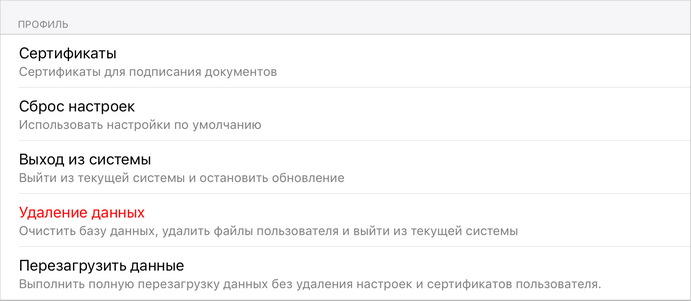 Сертификаты. Сертификаты для подписания документов. В открывшемся окне отображается список сертификатов сотрудника, зарегистрированных в Directum RX. Подписание документов электронной подписью необходимо настроить. Затем можно выбрать, какой из сертификатов использовать по умолчанию. Сброс настроек. Установка настроек по умолчанию. Выход из системы. При выходе из системы прекращается обновление данных и получение push-уведомлений о новых заданиях. При следующем запуске приложения необходимо ввести пароль. Удаление данных. Очищение базы данных, удаление файлов и выход из системы. При следующем запуске приложения необходимо ввести адрес веб-сервиса, логин и пароль. Перезагрузить данные. Удаление данных пользователя таких, как документы, папки, задания. Настройки приложения, учетные данные и сертификаты пользователя не удаляются. |