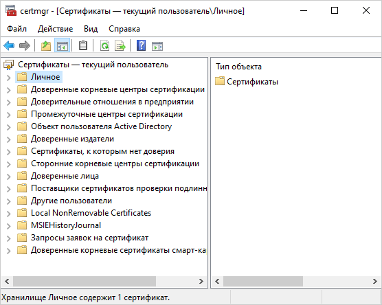 1.В меню Пуск выберите параметр Выполнить, а затем введите команду certmgr.msc. Отобразится инструмент диспетчера сертификатов для текущего пользователя: