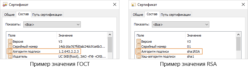 4.В открывшемся окне перейдите на вкладку «Состав». В поле Алгоритм подписи отобразится идентификатор алгоритма: