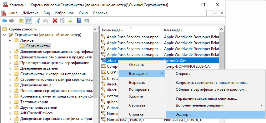 1.В контекстном меню сертификата последовательно выберите пункты Все задачи и Экспорт: