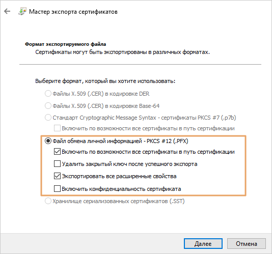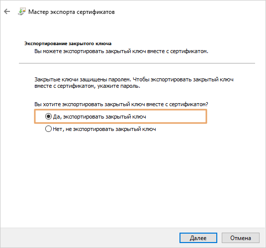 2.В открывшемся окне Мастера экспорта сертификатов нажмите на кнопку Далее. В открывшемся окне установите переключатель Да, экспортировать закрытый ключ и нажмите на кнопку Далее: