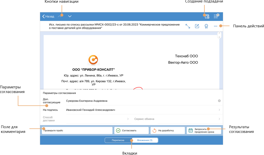 1.Откройте задание на согласование. На экране отображается первый документ из вкладки «Вложения».