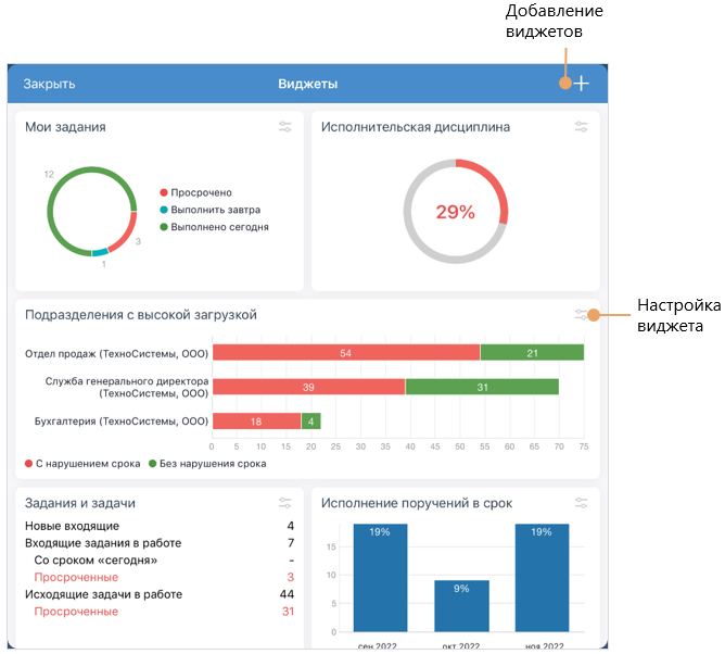Область виджетов – это контрольная панель с информацией по заданиям, документам, исполнительской дисциплине и загрузке. Каждый сотрудник может настроить область виджетов для получения необходимой информации и организации своей работы.