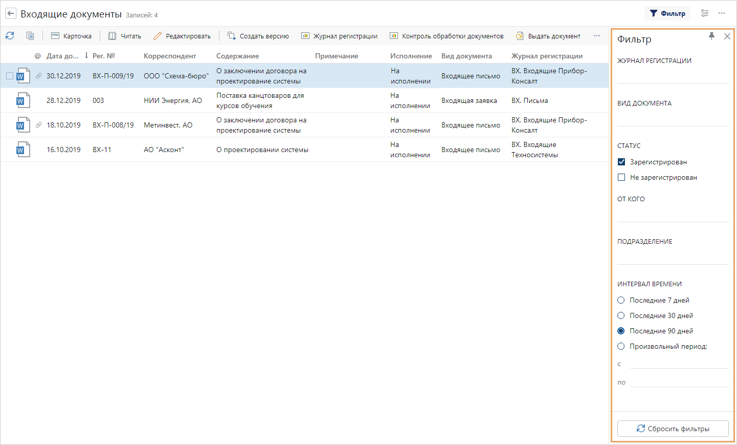 // В контроле "Набор флажков" отфильтровать по статусу документа «Зарегистрирован».