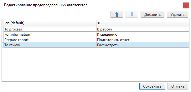 Допустимая длина одного автотекста – до 100 символов. Рекомендуется вводить максимум 10 фраз. Чтобы изменить порядок значений, используйте кнопки