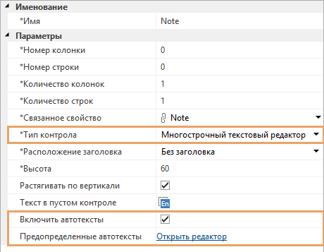 •контролов, которые связаны со свойствами типа Текст или Строка. Для свойства типа Строка параметр появляется, если в поле *Тип контрола выбрано значение «Многострочный текстовый редактор».