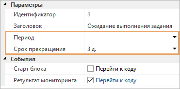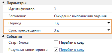 •если заполнено только свойство Срок прекращения, мониторинг выполняется один раз. Используйте этот вариант, если нужна пауза в бизнес-процессе. Например, сотруднику отправлено поручение. Нужно подождать 3 дня. Только после этого, если поручение выполнено, отправить контролеру уведомление (выход по ветке Успешно), а если не выполнено – задачу (выход по ветке Срок истек):