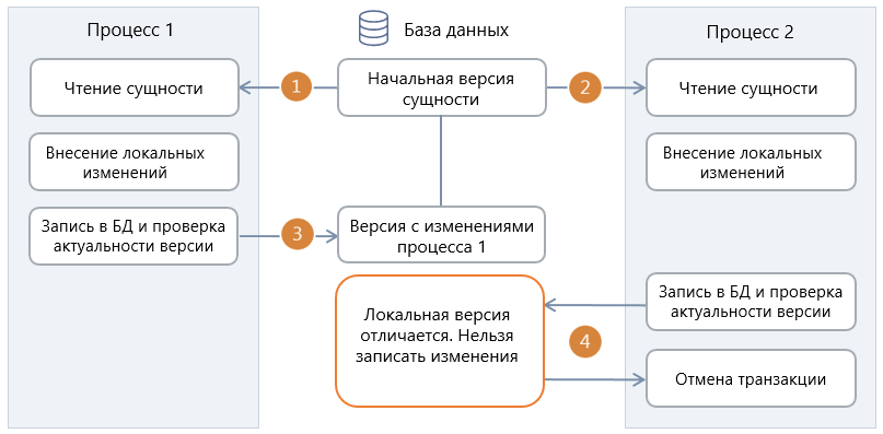4.Процесс 2 сравнивает изменяемую сущность с ее версией на сервере. Если есть различия, то изменения не записываются в базу данных.