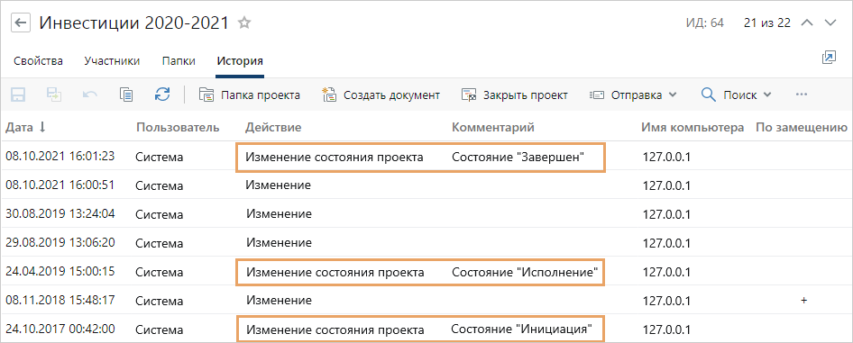 В результате при изменении состояния проекта в истории будет записываться информация об этом: