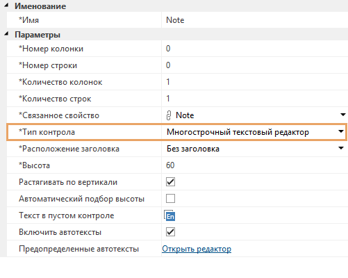 Высота контрола по умолчанию, задается в строках. Параметр отображается, если установлен флажок Автоматический подбор высоты