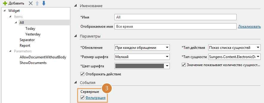 Предположим, разрабатывается виджет «Мои используемые документы» с действиями «Все время», «Сегодня» и «Вчера». Необходимо, чтобы у пользователя была возможность выбирать, какие данные будут отображаться в действиях виджета: по всем документам или только по документам, у которых есть содержимое. Для этого создайте логический параметр: