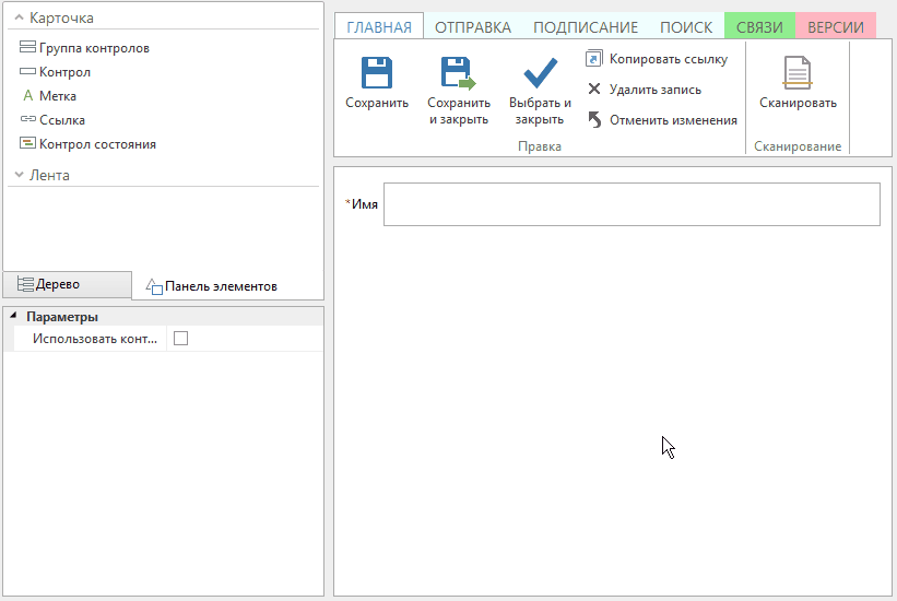 1.В дереве типа сущности выделите узел «Форма» и перейдите на вкладку «Панель элементов».