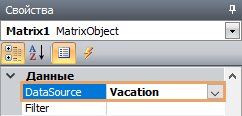 Оформление данных отчета в виде таблицы. В отличие от объекта «Таблица», количество строк и столбцов матрицы заранее не известно и зависит от источника данных, к которым подключен объект. После добавления матрицы на бэнд: •выделите матрицу мышью и в свойстве DateSourse укажите источник данных, с которым будет связана матрица: