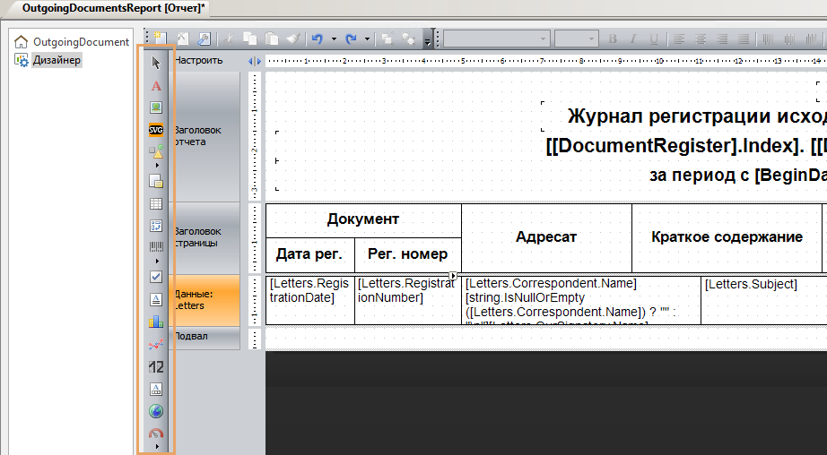 Для добавления объектов используются кнопки панели объектов, расположенной в левой части редактора отчета в узле «Дизайнер»: