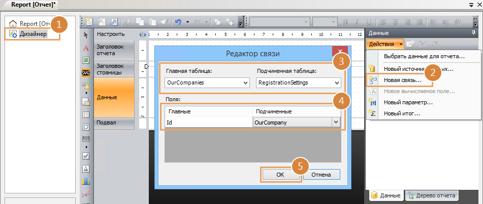Необходимо, чтобы в отчете сначала отображалась строка с названием организации, а потом все соответствующие ей настройки. Для этого добавьте связь между источниками данных. Так как к одной организации может относиться несколько настроек, то главным сделайте источник с информацией об организациях (OurCompanies), а подчиненным – с информацией о настройках (RegistrationSettings). Для этого: