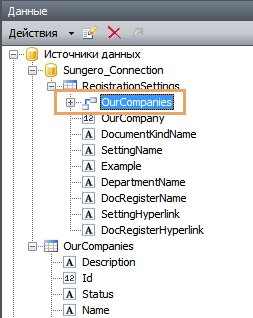 •OurCompanies – источник данных на основании типа сущности Наша организация (Sungero.Company.BusinessUnit);