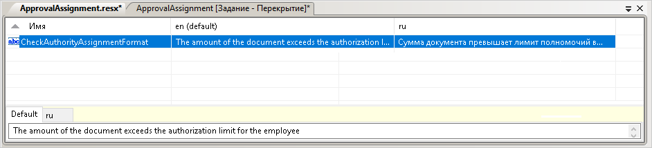 1.Добавьте ресурс для вывода предупреждения об ограничениях сотрудника в полномочиях. Для этого в дереве решений в контекстном меню задания Sungero.Docflow.ApprovalAssignment, перекрытого при добавлении предупреждения, выберите пункт Открыть ресурсы и добавьте ресурс с названием CheckAuthorityAssignmentFormat: