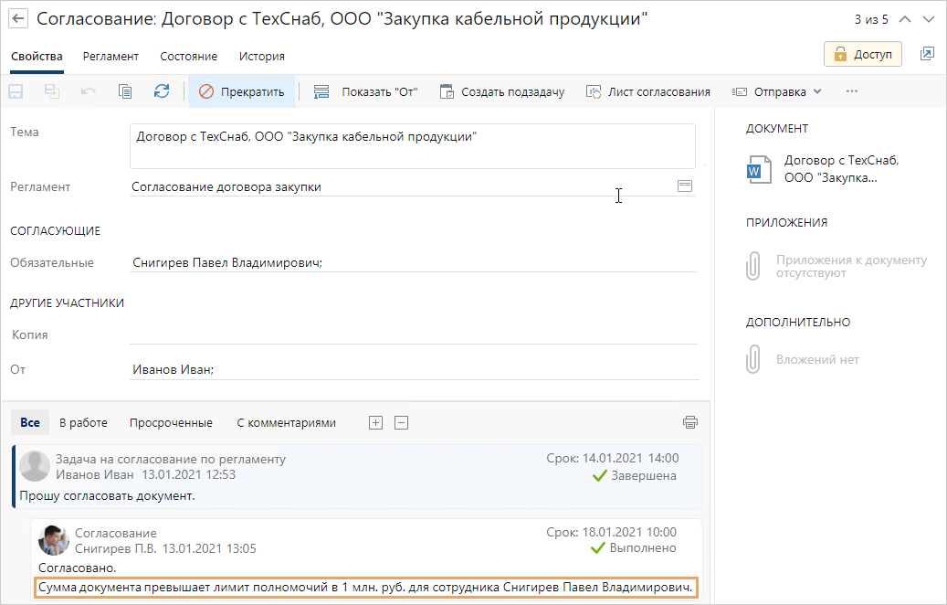 Предположим, на этапе согласования в задании добавлено предупреждение, которое информирует сотрудника об ограничениях в полномочиях. Чтобы отразить то, что сотрудник выполнил задание с превышением полномочий, зафиксируем информацию в тексте задания. Эти сведения могут понадобиться, например, для контролера при приемке задания.