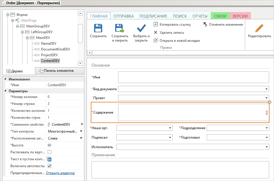 8.Добавьте новое свойство ContentDev на форму перекрытого типа документа: