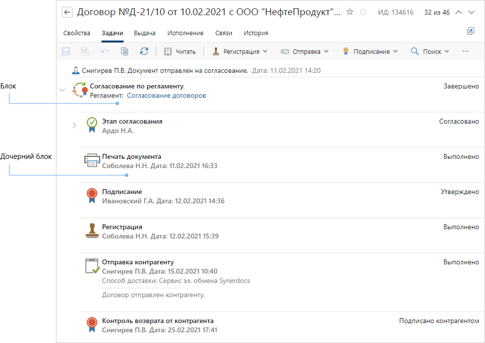 •отображение блоков в виде дерева. Например, в карточке договора на первом уровне находится задача на согласование документа. На втором – задания, созданные по задаче. Если у блока существуют дочерние блоки, то рядом с ним появится значок