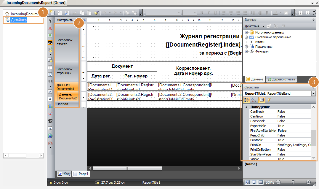 << Click to Display Table of Contents >> Разработка > Элементы разработки > Отчеты > Настройка макета отчета > Добавление бэндов Изменение свойств бэндов |