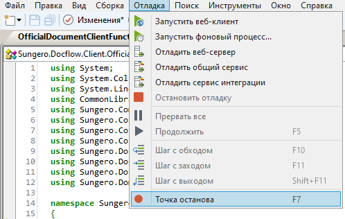 •установите курсор в нужную строку кода и в главном меню среды разработки Directum RX выберите пункт Точка останова: