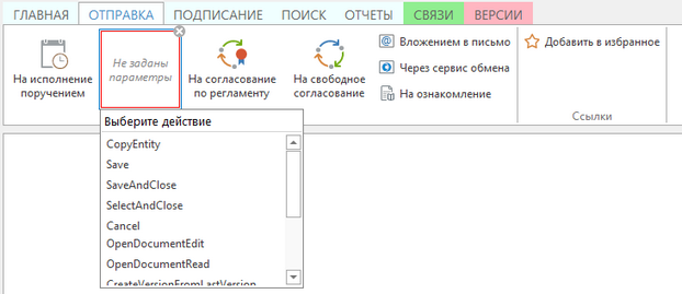 Предположим, что для входящего документа создано действие Отправка на рассмотрение руководителю. Действие нужно вынести на ленту карточки документа. На ленте уже есть вкладка Отправка и группа Отправить с однотипными действиями. Добавьте новое действие в данную группу: