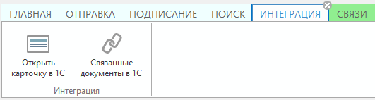 В результате на ленту карточки документа будет добавлена вкладка с двумя действиями. При необходимости на нее можно добавить другие группы и кнопки.