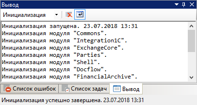 Совет. Чтобы при публикации отображались сообщения о порядке инициализации модулей, добавьте в код события или в функции инициализации метод InitializationLogger.Debug("Текст сообщения"). В тексте сообщения напишите, что будет выполняться в данный момент, например, «Создание роли «Инициатор закупки».