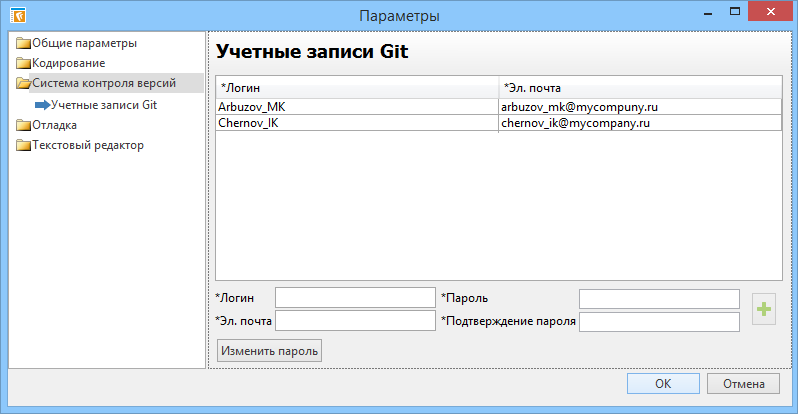 При первом запуске среды разработки появится окно аутентификации. Введите логин и пароль учетной записи Git. При следующем запуске окно аутентификации не появится. При необходимости разработчик может изменить пароль в параметрах среды разработки с помощью кнопки Изменить пароль. После смены пароля нужно вновь пройти аутентификацию.