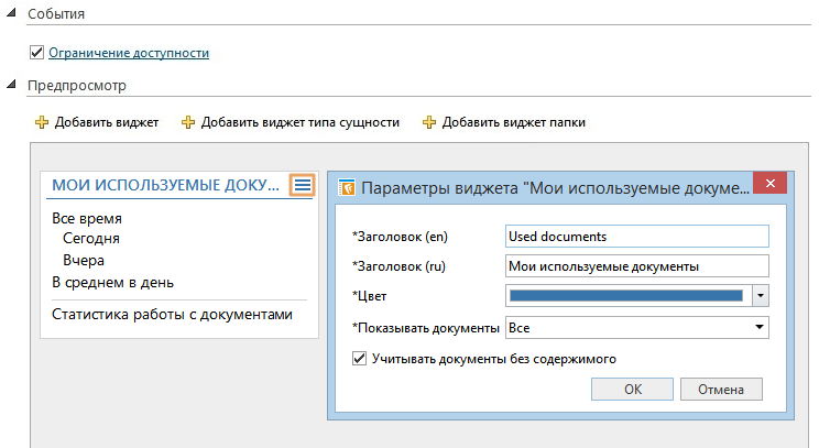 Совет. Чтобы посмотреть, как будет выглядеть окно с новыми параметрами, в редакторе решения в узле «Наборы виджетов» добавьте в набор необходимый виджет. В области предпросмотра нажмите на кнопку Параметры. Откроется окно настройки параметров: