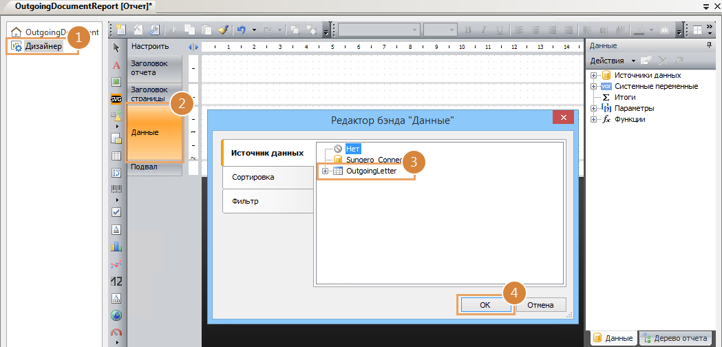Чтобы в отчете данные отображались в виде списка, бэнд «Данные» необходимо подключить к источнику данных. В этом случае в отчете отображаются все строки с данными, которые содержатся в источнике. Например, если для бэнда указан источник данных на основании типа сущности «Исходящие документы», то в отчете отобразятся все исходящие документы в порядке их создания в системе.