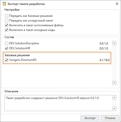 При экспорте пакета разработки обязательно включите в него базовые решения. Для этого в окне экспорта установите флажок рядом с базовым решением: