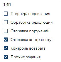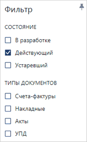 Набор флажков рекомендуется использовать, если у свойства сущности есть несколько значений и нужно выбирать их в различных комбинациях. Например, в списке «Финансовые документы» используется фильтрация по состоянию и типам документов: