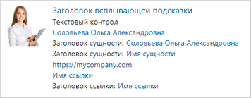 Выполняется, когда в проводнике веб-клиента пользователь наводит курсор на фото или имя сотрудника: •в списке или папке; •в поле Кому в карточке задачи; •в переписке по задаче, заданию или уведомлению; •в свойствах-ссылках; •в истории работы с сущностью; •в окне о блокировке содержимого документа другим сотрудником, а также в сообщении о блокировке карточки документа. Назначение. Показ всплывающей подсказки с информацией о сотруднике. Событие доступно только для типа сущности Пользователь (Sungero.CoreEntities.User) и его наследников, например, Сотрудник (Employee): Возвращаемое значение. Сформированная подсказка с информацией о сотруднике. Аргументы события: e.Entity – сущность, для которой вызывается событие. В базовом решении Directum RX обработчик события Показ подсказки задан для типа справочника Сотрудники (Employee). В нем вызывается функция GetEmployeePopup(), в которой формируется подсказка. Чтобы изменить подсказку, достаточно переопределить функцию либо написать свой код для наполнения содержимого. Чтобы создать подсказку с нуля либо изменить существующую, используйте класс UserDigest, а также методы и свойства его экземпляра UserDigest.Сreate(). В подсказку можно добавить заголовок, текстовый контрол, ссылки на сущности или внешние ресурсы. Пример: