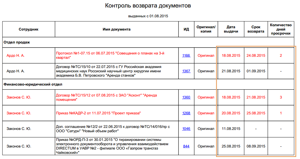 Предположим, необходимо разработать отчет с информацией о документах, которые выданы сотрудникам, но еще не возвращены или не подлежат возврату. Документы в отчете должны быть отсортированы следующим образом: