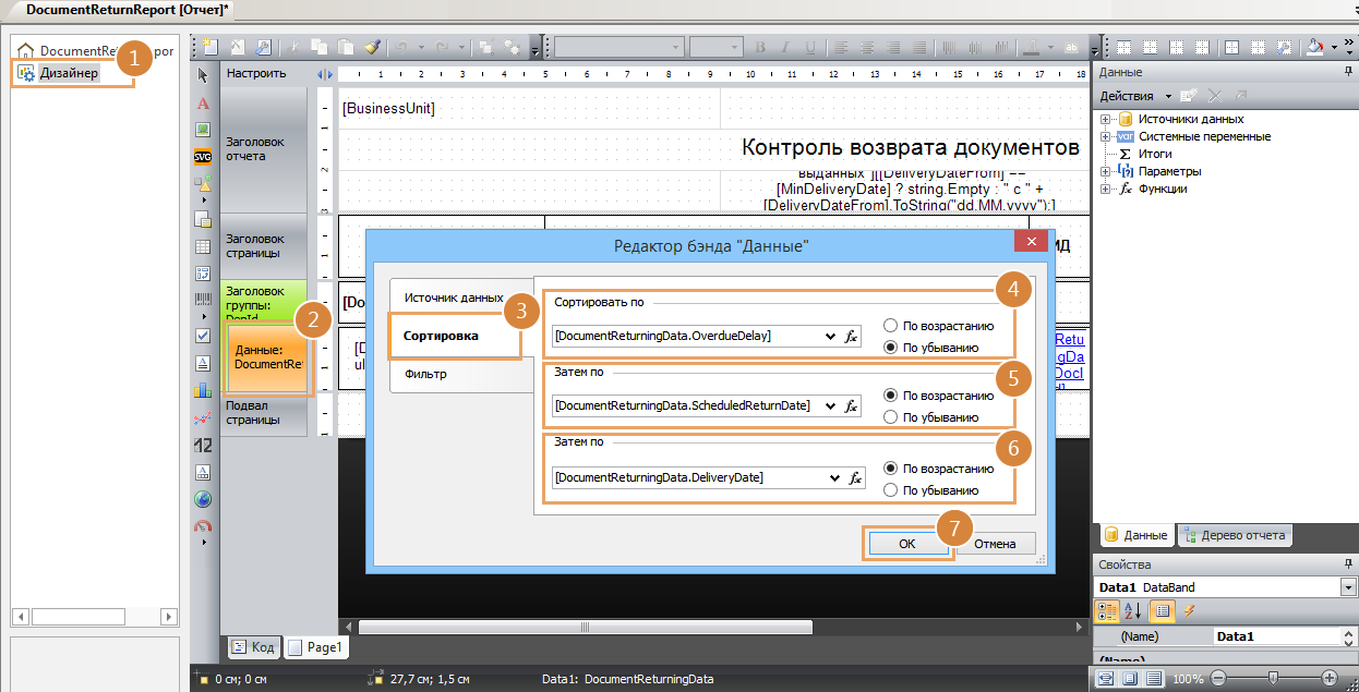 << Click to Display Table of Contents >> Разработка > Элементы разработки > Отчеты > Настройка макета отчета > Добавление бэндов Сортировка и фильтрация данных |