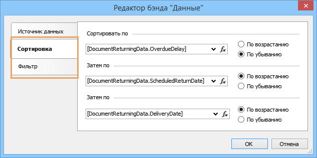4.В группе полей «Сортировать по» в выпадающем списке выберите поле источника данных, соответствующее количеству дней просрочки возврата (OverdueDelay) и установите переключатель По убыванию.